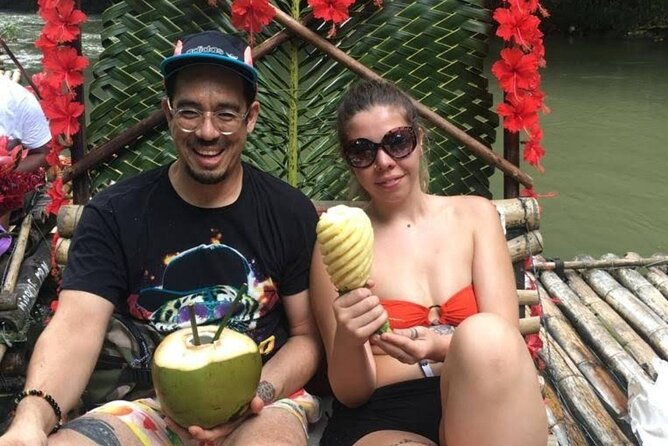 Travelers can enjoy sugarcane juice, coconuts, or Red Stripe Beer during the bamboo raft ride.