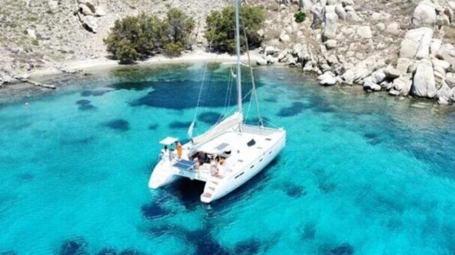 - Explore the pristine Aegean Sea aboard a luxurious catamaran, cruising along Mykonos’ southern coast and the secluded island of Rhenia.