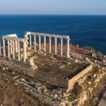 Breathtaking views of the Aegean Sea and Saronic Gulf greet visitors at Cape Sounion, where the ancient Temple of Poseidon stands as a testament to Greece’s rich cultural heritage.