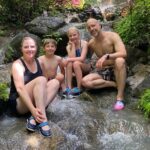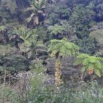The trail winds through lush tropical forests, passing by vibrant plant life and towering boulders.