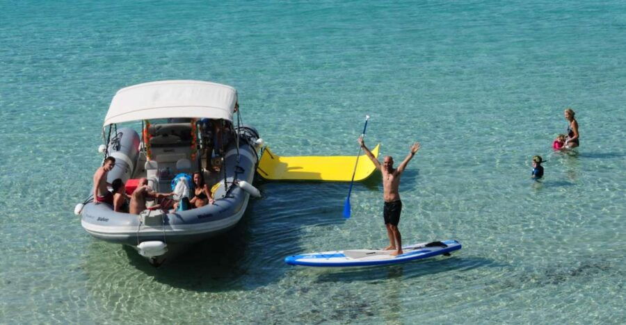 Guests embark from the San Antonio Port, ready to explore beautiful coves and nature reserves. This tour provides an exciting opportunity for swimming, snorkeling, and stand-up paddleboarding in crystal-clear waters.