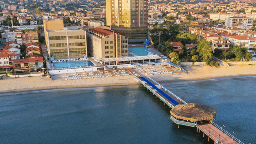 Upon arrival, visitors are greeted with the hotel’s prime location on the coast of the Marmara Sea, offering direct access to the private sandy beach.