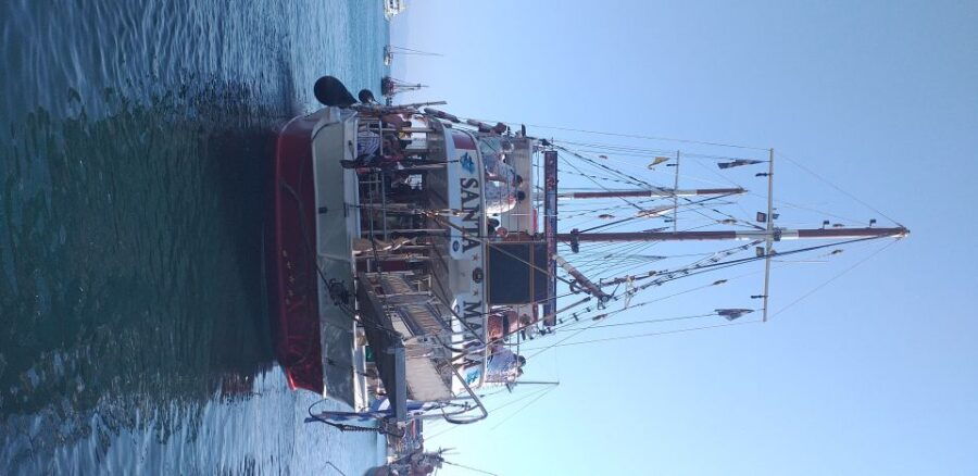 Aboard the Santa Maria, an 80-foot wooden boat, passengers can enjoy a Greek BBQ lunch, sundecks, shaded areas, and a bar. The cruise is available in multiple languages and features free cancellation up to 24 hours in advance.