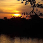 As the sun dips below the horizon, the clouds transform into a canvas of warm oranges, fiery reds, and soft pinks. The reflection of these colors dances across the calm waters of the Madre de Dios River, creating a serene and picturesque scene.