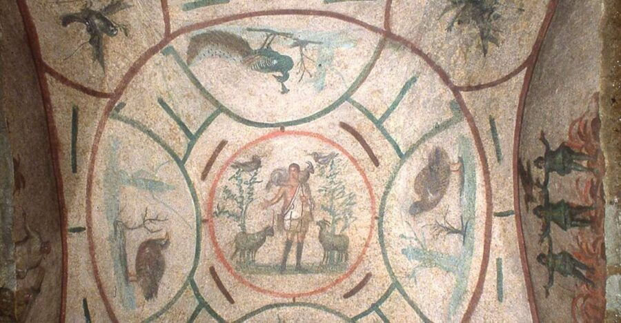 Frescoes depicting biblical scenes, such as the Good Shepherd and Orpheus charming the animals.