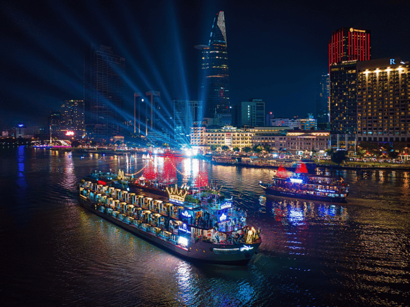 Cruising along the vibrant city lights of Saigon River