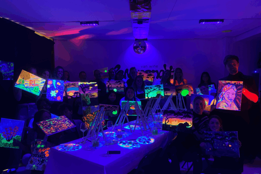 The Sip and Paint in the Dark event at Rembrandt van Wine provides an ideal social atmosphere for friends, family, or solo outings.