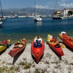 Participants receive instruction on kayaking equipment from the guide before paddling west along the coast. The tour includes views of pine and olive trees, beaches, and the sunset from the sea.