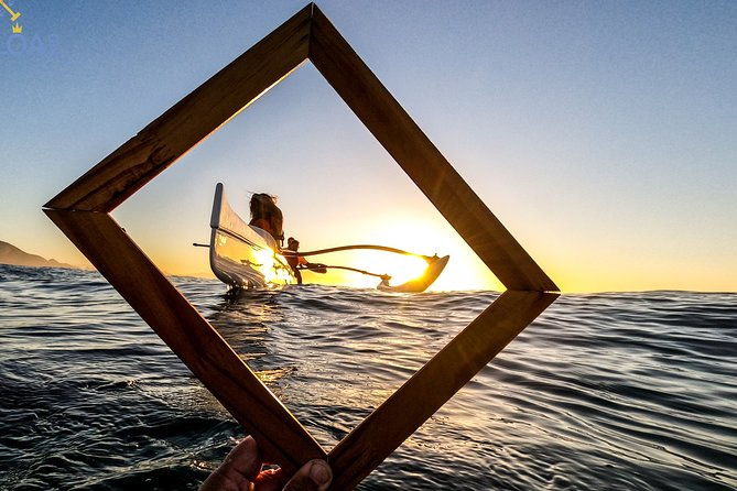 A professional photographer captures 5 stunning, edited photos for guests to remember their unique sunset paddling experience in a traditional Polynesian canoe.