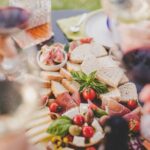 The menu highlights an exquisite selection of gourmet cheeses, various cured meats including prosciutto, and a fine array of local wines.