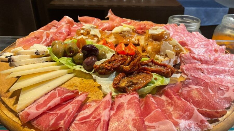 Each wine is expertly paired with a platter of Tuscan appetizers, including Italian olives, bruschetta, salami, and prosciutto, providing a harmonious flavor experience.